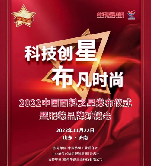 ![]() 誰是用戶最滿意的面料,2022中國(guó)面料之星發(fā)布儀式給你答案。由中國(guó)紡織工業(yè)聯(lián)合會(huì)指導(dǎo)、《紡織服裝周刊》雜志社主辦、德州華源生態(tài)科技有限公司支持的2022“中國(guó)面料之星”發(fā)布儀式將于2022年11月22日在山東濟(jì)南的山東手造展示體驗(yàn)中心舉行,來自全國(guó)的數(shù)百家面料企業(yè)的上千款產(chǎn)品中脫穎而出的50家優(yōu)秀企業(yè)將來到現(xiàn)場(chǎng),見證發(fā)布儀式與榮耀歸屬,并聆聽最新的中國(guó)面料之星趨勢(shì)報(bào)告。