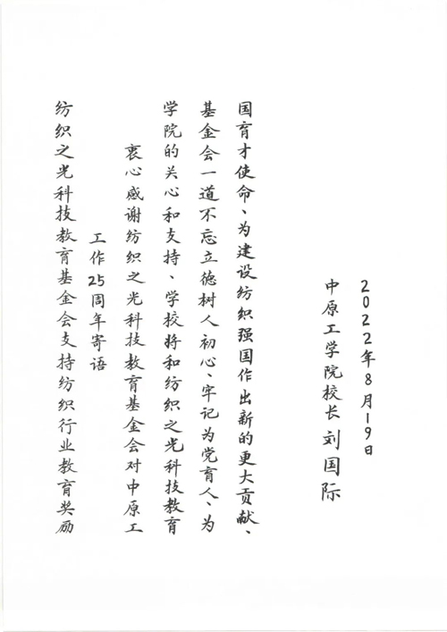 ![]() 中原工學院黨委副書記、院長劉國際寄語紡織之光科技教育基金會開展行業教育獎勵25周年