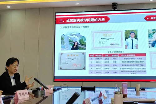 ![]() 葉靜重點(diǎn)介紹了項(xiàng)目成果主要解決的教學(xué)問題和方法、項(xiàng)目成果特色與創(chuàng)新點(diǎn)。她分享到,成果主要從構(gòu)建微觀校企協(xié)同育人教學(xué)模式;構(gòu)建基于產(chǎn)業(yè)需求的課程教學(xué)體系;融入思政元素,擴(kuò)展和優(yōu)化教學(xué)內(nèi)容,創(chuàng)立多渠道、多元化立體學(xué)習(xí)空間;推進(jìn)教學(xué)手段和方法改革等方面解決教學(xué)問題和方法。項(xiàng)目的成果特色和創(chuàng)新點(diǎn)在于,基于利益視角建立校企雙方共贏的共同目標(biāo),實(shí)現(xiàn)校企合作長效化發(fā)展;構(gòu)建了以產(chǎn)業(yè)需求為導(dǎo)向的三位一體的課程體系;構(gòu)建了多方位的《新型紡紗技術(shù)》課程微觀校企協(xié)同育人教學(xué)模式;創(chuàng)立了基于“現(xiàn)代紡織”理念下的“五關(guān)聯(lián)”教學(xué)方法;建立了創(chuàng)新指向的學(xué)科競賽與畢業(yè)設(shè)計(jì)相融合的實(shí)踐教學(xué)模式。