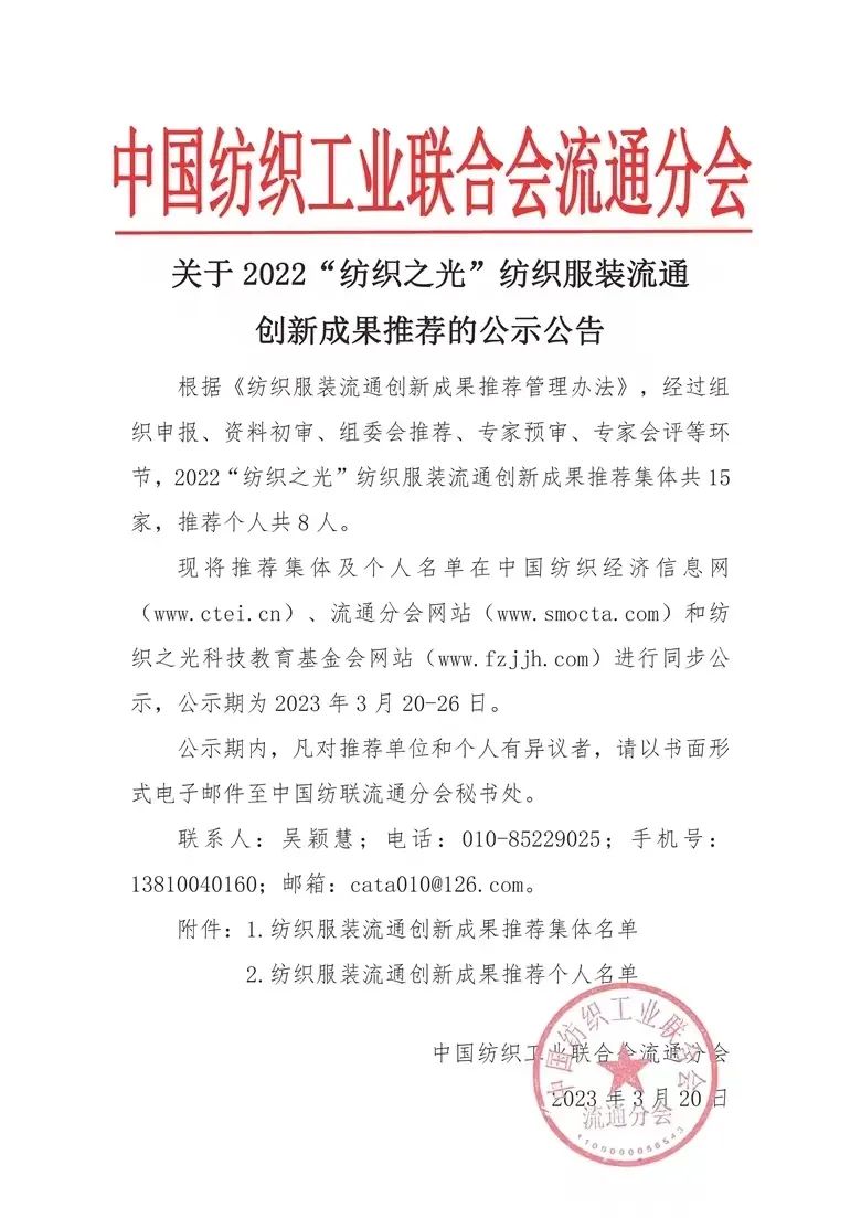 公告提到,現將推薦集體及個人名單在中國紡織經濟信息網(www.ctei.cn)、流通分會網站(www.smocta.com)和紡織之光科技教育基金會網站(www.fzjjh.com)進行同步公示,公示期為2023年3月20-26日。