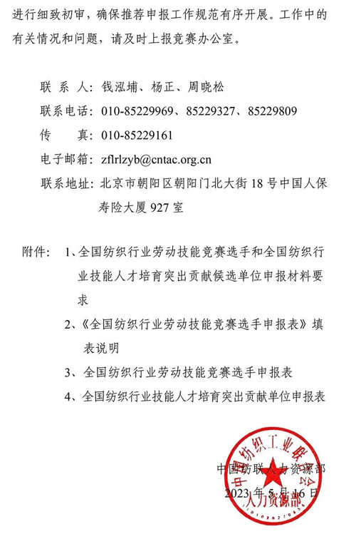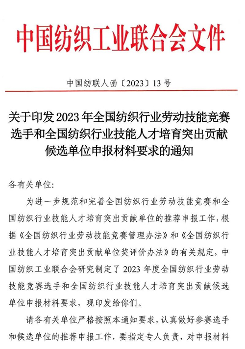 為進一步規(guī)范和完善全國紡織行業(yè)勞動技能競賽和全國紡織行業(yè)技能人才培育突出貢獻單位的推薦申報工作,根據(jù)《全國紡織行業(yè)勞動技能競賽管理辦法》和《全國紡織行業(yè)技能人才培育突出貢獻單位獎評價辦法》的有關(guān)規(guī)定,中國紡織工業(yè)聯(lián)合會研究制定了2023年度全國紡織行業(yè)勞動技能競賽選手和全國紡織行業(yè)技能人才培育突出貢獻候選單位申報材料要求,內(nèi)容如下: