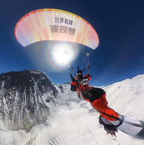 為紀念人類首次登頂珠峰70周年,2023年5月18日9時14分,中國波司登珠峰登山隊隊員木子(李生濤)從珠穆朗瑪峰海拔8000米的南坳,使用無動力單人滑翔傘起飛,經過20多分鐘的飛行,安全降落在預定區域,創造了中國滑翔傘飛行員的起飛高度紀錄,為波司登助力登峰事業再添濃墨重彩。