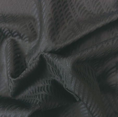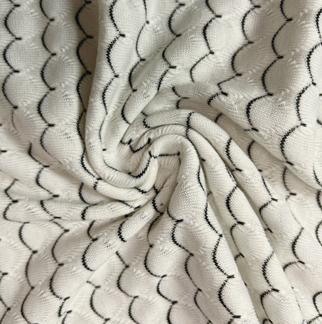 產品特點:用TR黑白紗+氨綸定織出魚鱗般的提花風格,布面松散不緊密,透氣性強。