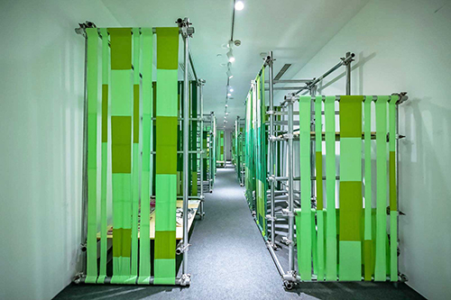 ![]() 作為展覽的壓軸之作,解構與重組城市叢林的現代科技,不同材質、形態的舊椅子升級再造,能否令人回歸于“人閑桂花落,青青山澗中”的向往?明暗相見的SORONA?生物基材料制成的面料結合回收腳手架結構,在明亮燈光的映射下,創造出一片靜謐幽深的“竹徑”。空間盡頭設有休憩、閱讀、陳列三個功能區域,其中閱讀區陳列有SAME PAPER為本次展覽特別提供的30本珍藏樣書,讓藝術感與實用性“相遇”,將自然與生活合二為一,徘徊在一段浸染了時間與記憶的共生情感間。