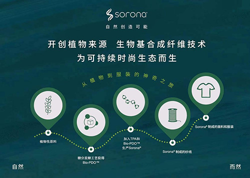 SORONA?是一項突破性的新型生物基聚合物解決方案,其核心原料來自每年可重復生長的植物。SORONA?不僅具有符合潮流趨勢的可持續發展和環保主題,而且可以為纖維帶來多種功能的優良特性。用SORONA?原料制成的纖維的“多功能性”為面料和服裝設計師提供了更大范圍的設計自由!