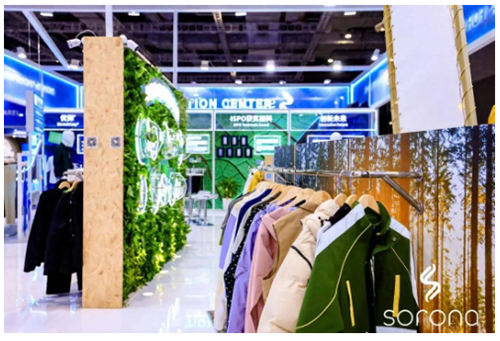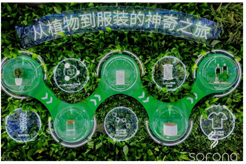 來到SORONA?展位,C位的植物墻記錄了SORONA?從誕生到服裝的生命周期歷程。SORONA?生物基材料利用可重復生長的植物性資源,憑借自然界所蘊藏的強大力量,有效降低了生產過程中對石油資源的消耗與碳排放。作為植物來源生物基合成纖維技術的先驅,SORONA?打破傳統纖維產業(yè)重度依賴石油和石化產品的局面,從此不再桎梏于傳統時尚工業(yè)的高耗能。