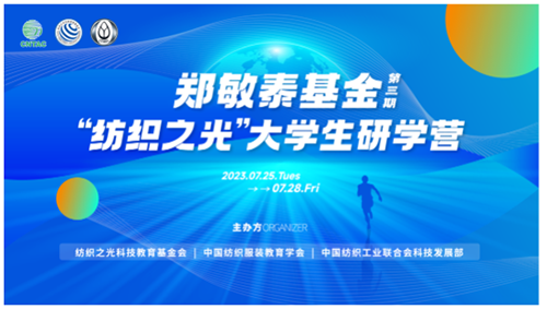 鄭敏泰基金第三期“紡織之光”大學(xué)生研學(xué)營(yíng)由紡織之光科技教育基金會(huì)、中國(guó)紡織服裝教育學(xué)會(huì)、中國(guó)紡織工業(yè)聯(lián)合會(huì)科技發(fā)展部主辦,獲得了紡織之光科技教育基金會(huì)鄭敏泰專項(xiàng)基金的經(jīng)費(fèi)支持,以及佛山維彩紡織有限公司、中聯(lián)品檢(福建)檢測(cè)服務(wù)有限公司捐贈(zèng)物資,同時(shí)獲得了中國(guó)紡織規(guī)劃研究會(huì)、中國(guó)流行色協(xié)會(huì)、江蘇富之島美安紡織品科技有限公司、江蘇大生集團(tuán)有限公司的大力支持。