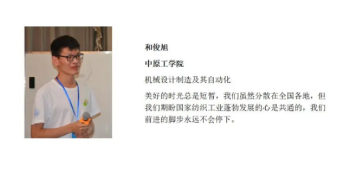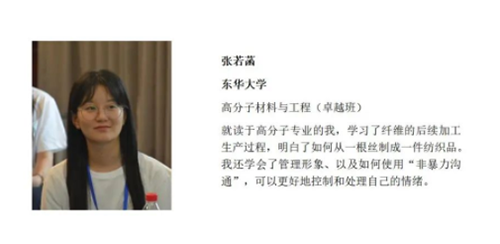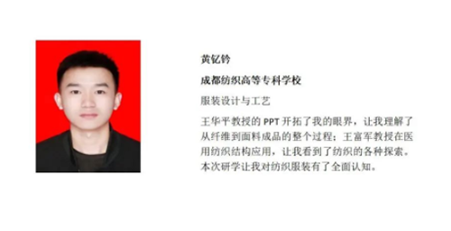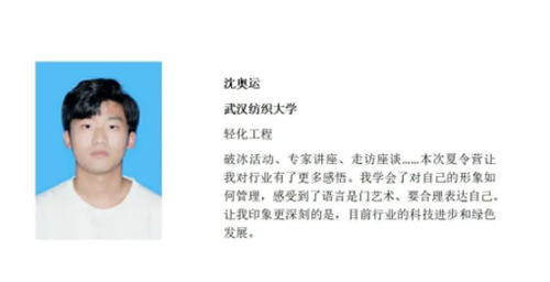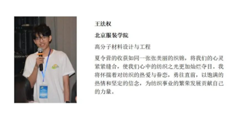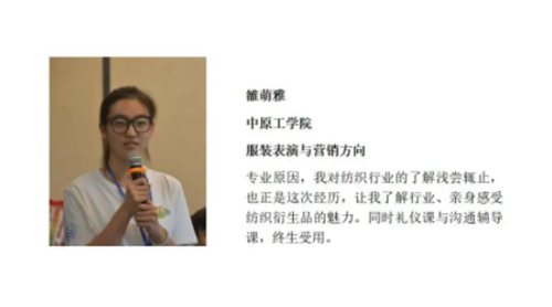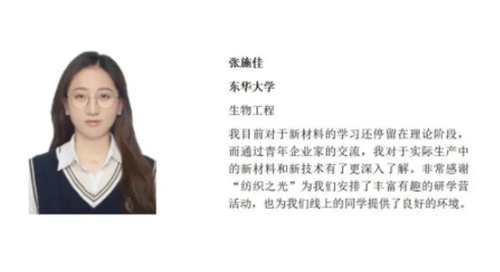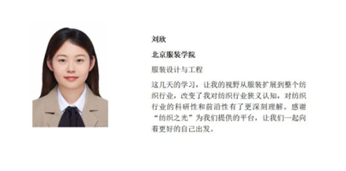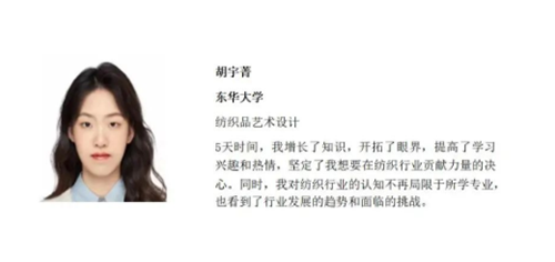 研學(xué)營(yíng)第一、二期優(yōu)秀學(xué)員,有的已在行業(yè)就業(yè)、有的尚在深造。令人感動(dòng)的是,他們?yōu)榈谌趯W(xué)員送上了真摯祝福——“希望大家以夢(mèng)為馬、不負(fù)韶華;希望五湖四海的同學(xué)們,相互學(xué)習(xí)、并肩前行;愿所有熱愛紡織服裝的小伙伴,都能在各自領(lǐng)域發(fā)光發(fā)熱……”