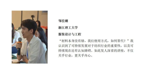 ![]() 紡織工業(yè)是責(zé)任導(dǎo)向的綠色產(chǎn)業(yè)。中國(guó)紡織工業(yè)聯(lián)合會(huì)社會(huì)責(zé)任辦公室副主任胡柯華深度解讀到,“要解決綠色可持續(xù)問題,需要重新思考我們的生產(chǎn)和生活方式”。他寄望同學(xué)們“在未來的學(xué)習(xí)和工作中,用全價(jià)值鏈的視角思考如何解決問題,看清自己腳下的路和未來行業(yè)的路。”