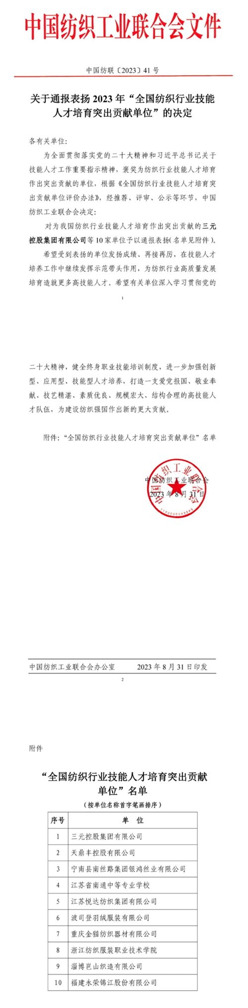 為全面貫徹落實黨的二十大精神和習近平總書記關于技能人才工作重要指示精神,褒獎為紡織行業技能人才培育作出突出貢獻的單位,根據《全國紡織行業技能人才培育突出貢獻單位評價辦法》,經推薦、評審、公示等環節,中國紡織工業聯合會決定:對為我國紡織行業技能人才培育作出突出貢獻的三元控股集團有限公司等10家單位予以通報表揚。