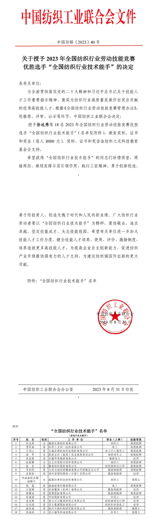 為全面貫徹落實黨的二十大精神和習近平總書記關于技能人才工作重要指示精神,褒獎為紡織行業高質量發展作出突出貢獻的優秀高技能人才,根據《全國紡織行業勞動技能競賽管理辦法》,經推薦、評審、公示等環節,中國紡織工業聯合會決定:授予孫遠秀等18名2023年全國紡織行業勞動技能競賽優勝選手“全國紡織行業技術能手”(名單見附件),頒發獎杯、證書和獎金(每人8000元)。獎杯、證書和獎金由紡織之光科技教育基金會支持。