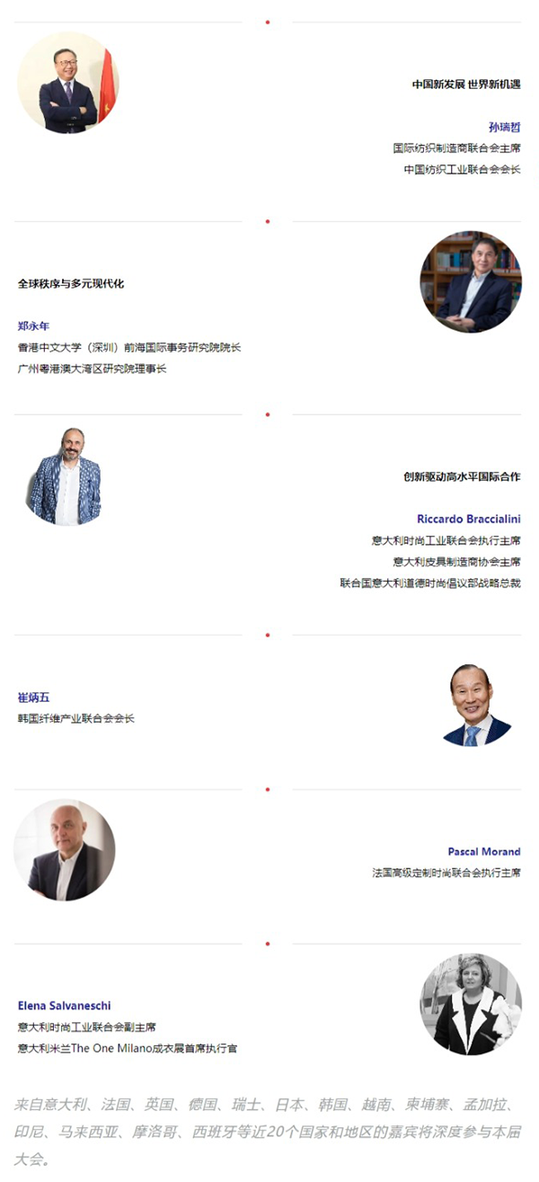 本次大會陣容強大、嘉賓云集,不僅將有有關政府領導、駐華使領館代表出席活動,更將匯聚來自意大利、法國、英國、德國、瑞士、日本、韓國、越南、柬埔寨、孟加拉、印尼、馬來西亞、摩洛哥、西班牙等近20個國家和地區的海外組織、行業協會、專家學者和企業家,分享行業發展的全球視角與獨到見解。
