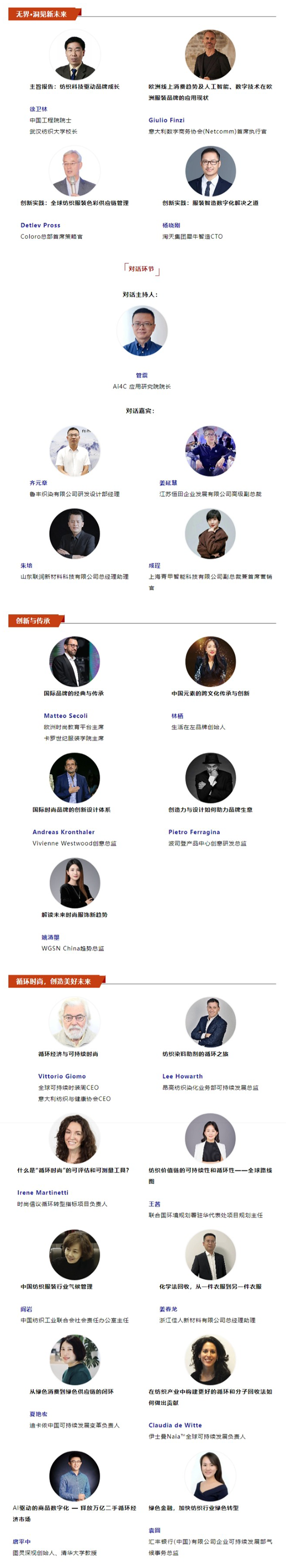 “2023世界服裝大會主題論壇”由“科技論壇”“時尚論壇”“昂高·可持續論壇”三個分論壇組成,將匯集全球專家、行業精英,探討未來發展趨勢方向,拓展價值合作路徑空間,推動科技合作,深化時尚創意,聚焦可持續發展,探尋行業未來。