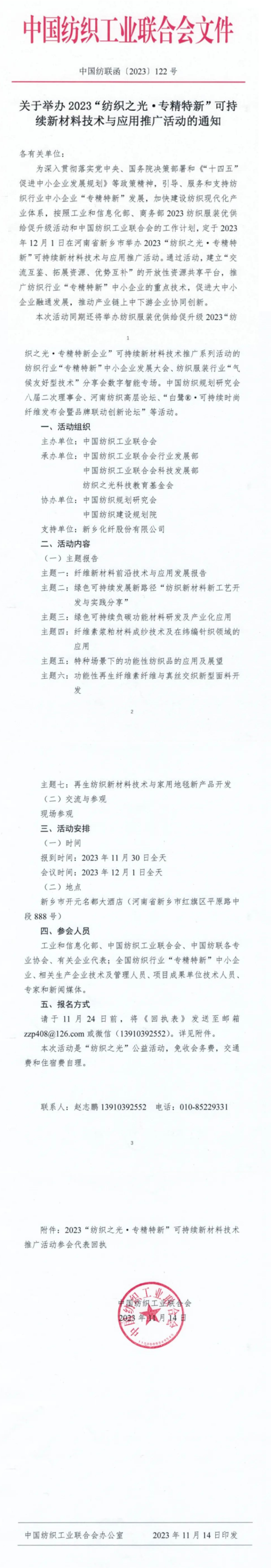 為深入貫徹落實黨中央、國務院決策部署和《“十四五”促進中小企業發展規劃》等政策精神,引導、服務和支持紡織行業中小企業“專精特新”發展,加快建設紡織現代化產業體系,按照工業和信息化部、商務部2023紡織服裝優供給促升級活動和中國紡織工業聯合會的工作計劃,定于2023年12月1日在河南省新鄉市舉辦2023“紡織之光·專精特新”可持續新材料技術與應用推廣活動。