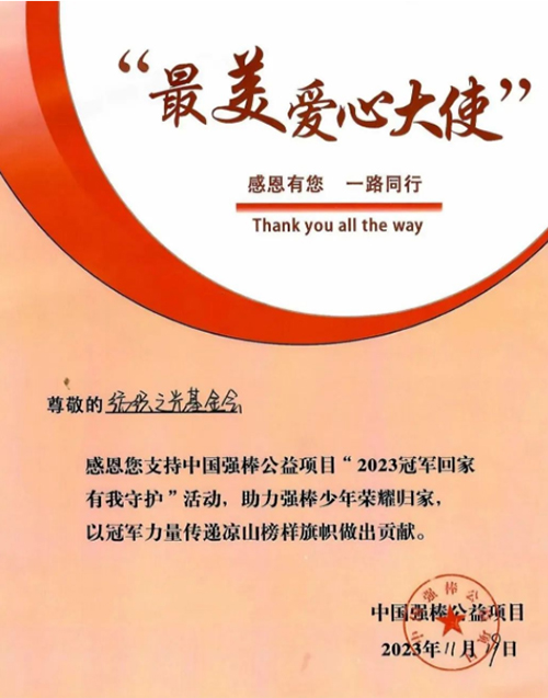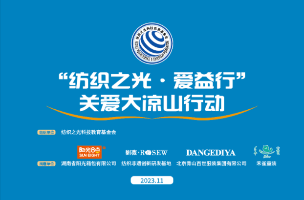 2023年11月20日,“紡織之光·愛益行”行動再次啟航,在四川省涼山彝族自治州開展了“紡織之光·愛益行”關愛大涼山行動捐贈儀式,攜手強棒天使基地,助力“冠軍之師,榮耀歸家”強棒天使回家計劃取得成功。
