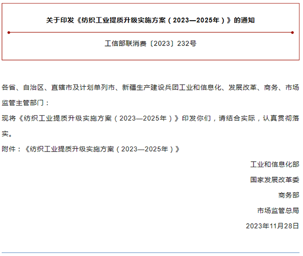 | 工信部等四部門聯(lián)合印發(fā)《紡織工業(yè)提質升級實施方案(2023—2025年)》 |