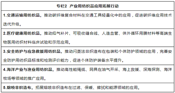 6.擴大產業(yè)用紡織品在國民經(jīng)濟各領域的應用。支持企業(yè)、行業(yè)協(xié)會等機構以國民經(jīng)濟各領域需求為導向,與有關方面加強交流合作,擴大產業(yè)用紡織品在航空航天、基礎設施建設、環(huán)境保護、建筑、能源、國防軍工等領域的應用。