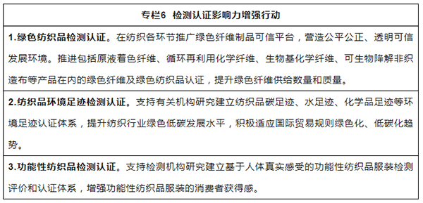 20.增強紡織品檢測認證市場影響。支持開展紡織品檢測認證服務,推進國內檢測認證機構與國際有關機構加強交流合作和結果互認,提升紡織品的品質和功能性,豐富紡織品的內涵和價值。