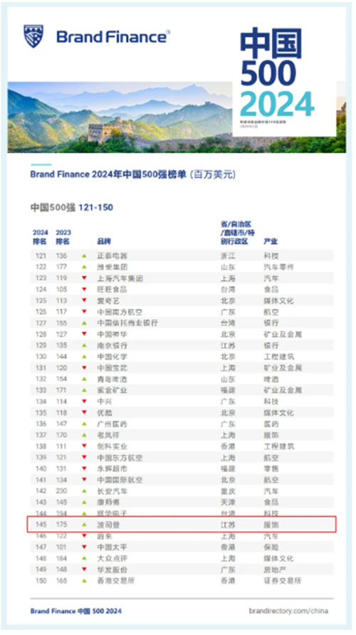 隨著中國制造綜合實力不斷提升,中國品牌正以前所未有的速度和影響力崛起。近日,國際知名品牌價值評級機構Brand Finance(品牌金融)發布“2024年中國品牌價值500強”榜單。作為中國服飾行業的佼佼者,波司登憑借其卓越的品牌影響力和市場認可度,再度上榜中國品牌價值500強(145位),并在排名中躍升了30位。