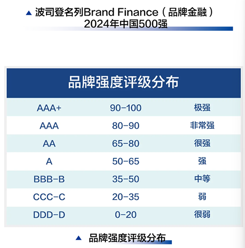 ![]() 根據Brand Finance(品牌金融)2024年度中國品牌價值500強報告,數個服飾品牌在品牌強度方面實現顯著提升。其中,波司登品牌價值增長了13%,達到21.41億美元,在最新的中國品牌價值500強的排名中躍升了30位;品牌強度指數得分提升至85.05,并獲得了AAA評級。