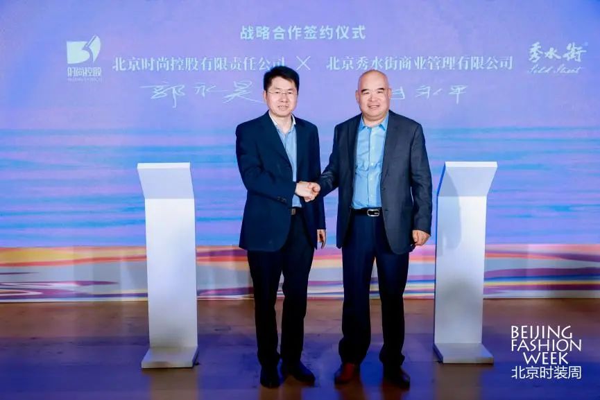 ![]() 北京時尚控股有限責任公司黨委副書記、董事、總經理郭永昊(左)與北京秀水街商業管理有限公司董事長張永平(右)進行戰略簽約