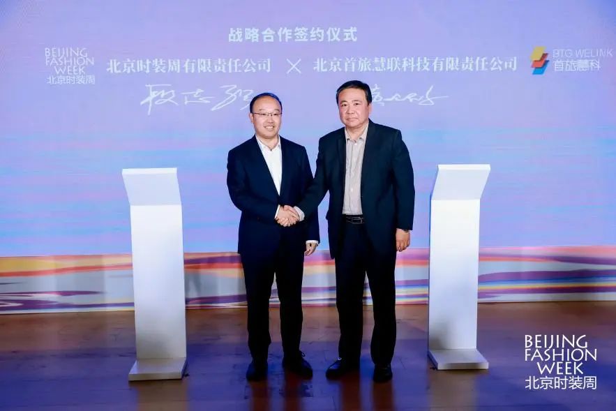 ![]() 北京時尚控股有限責任公司董事會秘書、辦公室主任、北京時裝周有限責任公司執行董事段志強(左)與北京首旅慧聯科技有限責任公司董事、總經理黃璐京(右)進行戰略簽約