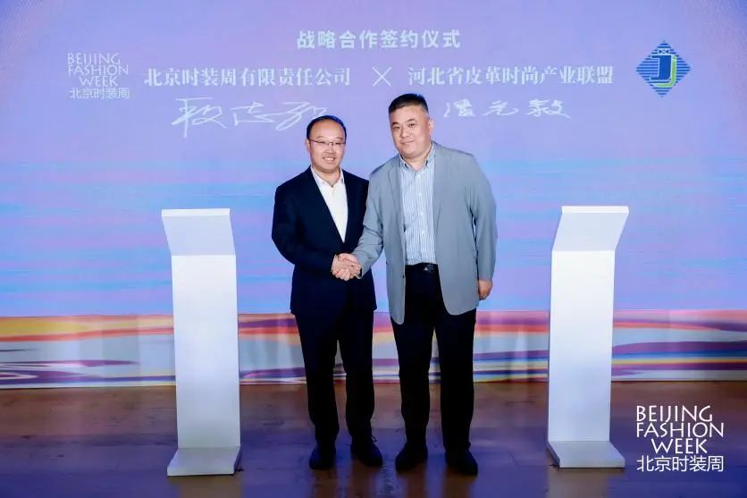 ![]() 北京時尚控股有限責任公司董事會秘書、辦公室主任、北京時裝周有限責任公司執行董事段志強(左)與河北省皮革時尚產業聯盟秘書長潘光毅(右)進行戰略簽約