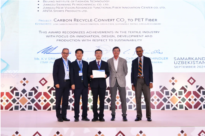 9月8-10日,2024國際紡織制造商聯合會年會暨國際服裝聯盟時尚大會在烏茲別克斯坦舉行。由江蘇國望高科纖維有限公司、北京服裝學院、江蘇斯爾邦石化有限公司、江蘇新視界先進功能纖維創新中心有限公司、安踏體育用品有限公司等單位申報的《碳循環:從二氧化碳到聚酯纖維》榮獲“國際紡聯可持續和創新獎”,這是2024年中國唯一獲此獎項的項目。