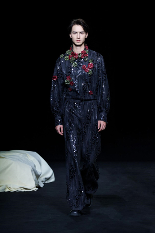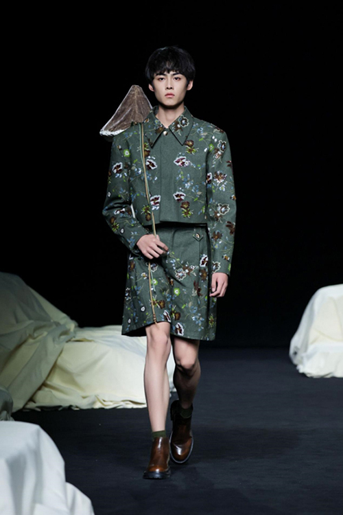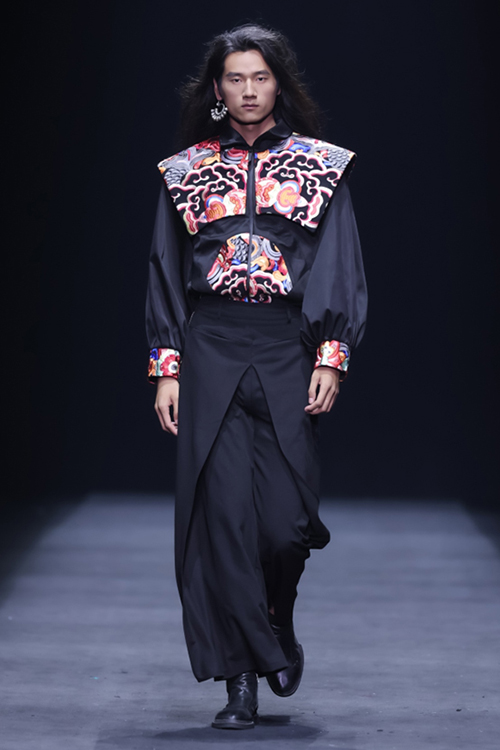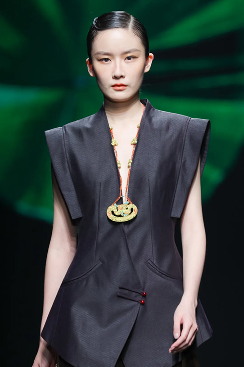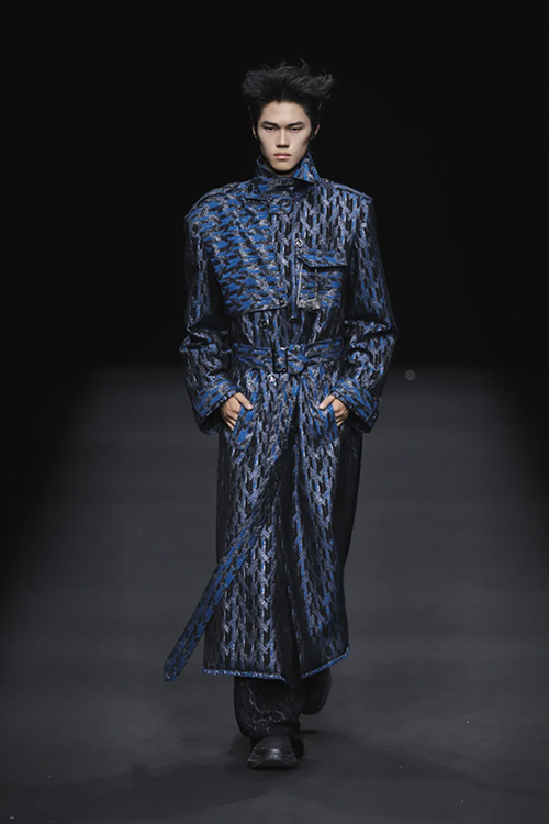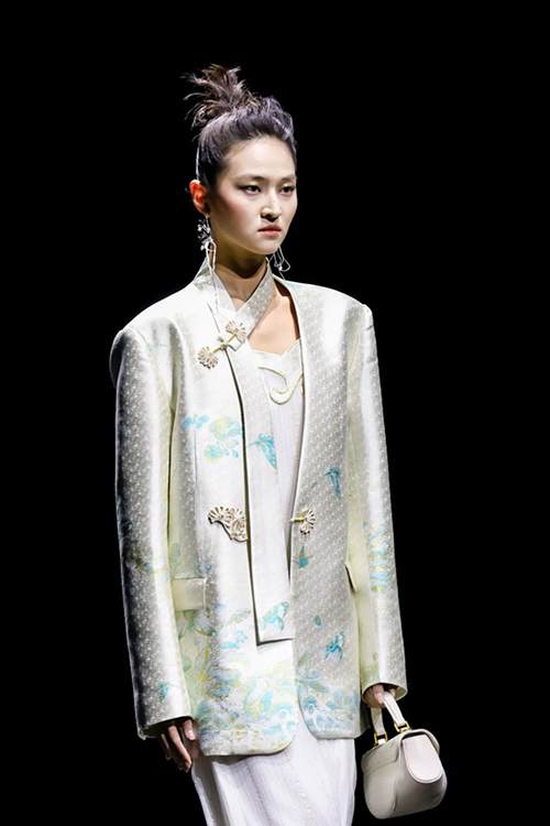 作為頂級織錦宋錦的非遺傳承者,“讓非遺年輕起來”一直都是上久楷探索的方向。本季,設計師運用仿螺鈿紗線刺繡、宋錦羊毛羊絨混織、招財荷包袖以及廓形夾克衫等工藝及款式,繼續將細膩的宋錦與溫柔的羊絨、粗獷的羊毛進行混織,制造出了時尚且耐用的新型提花面料。打破了傳統織造理念,展示出宋錦現代化應用的多面性。