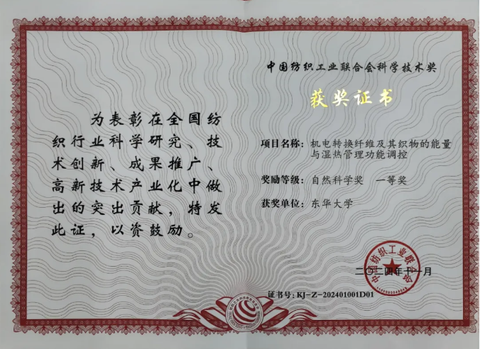 2024年度中國紡織工業(yè)聯(lián)合會科學(xué)技術(shù)獎近日揭曉。由東華大學(xué)材料學(xué)院王宏志教授作為項目第一完成人研發(fā)的“機電轉(zhuǎn)換纖維及其織物的能量與濕熱管理功能調(diào)控”項目(以下簡稱“機電轉(zhuǎn)換項目”),獲得了自然科學(xué)獎一等獎。該項目在智能纖維領(lǐng)域?qū)崿F(xiàn)雙重突破,開創(chuàng)了纖維材料的能量轉(zhuǎn)換和人體濕熱管理的新途徑。