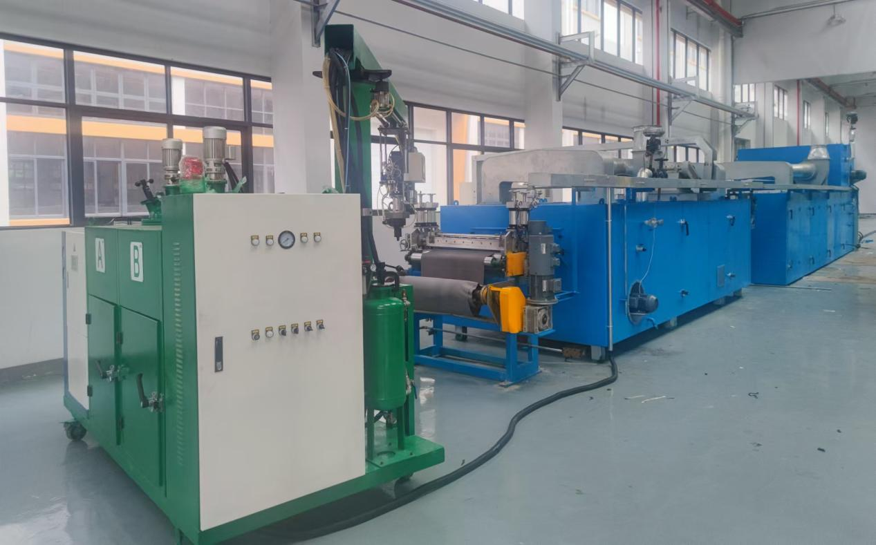 團隊面向反應性PU聚合/成型同步特點和實際高車速生產特性,基于分階段調控新工藝,創制了成套生產新設備:研制了與“鏈擴展”管式混合預聚技術相匹配的“促擴鏈-抑凝膠”型共混噴射系統,解決了因PU自聚發熱導致的凝膠化提前問題;開發了與“凝膠化”可逆交聯相適應的折返式梯度溫控“熟化”系統;研發了與“相分離”階段相適配的張力和速度精準同步協調的閉環控制生產系統,提高整體均勻性。