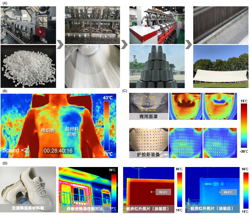 ![]() 柔性光電超構織物的多物理量精準響應機制與穩定成型技術。(A)實現了萬噸級柔性光電超構織物的高穩定性、高通量生產工藝;(B)柔性光電超構織物實現了人體皮膚表面有效降溫約5 ℃;(C)研制了具有高氣通量保暖護臉新裝備,可顯著提高吸入空氣溫度和面部皮膚溫度;(D)研制了降溫鞋和降溫微納米纖維增強涂料,可有效降低足部和建筑物室內溫度。