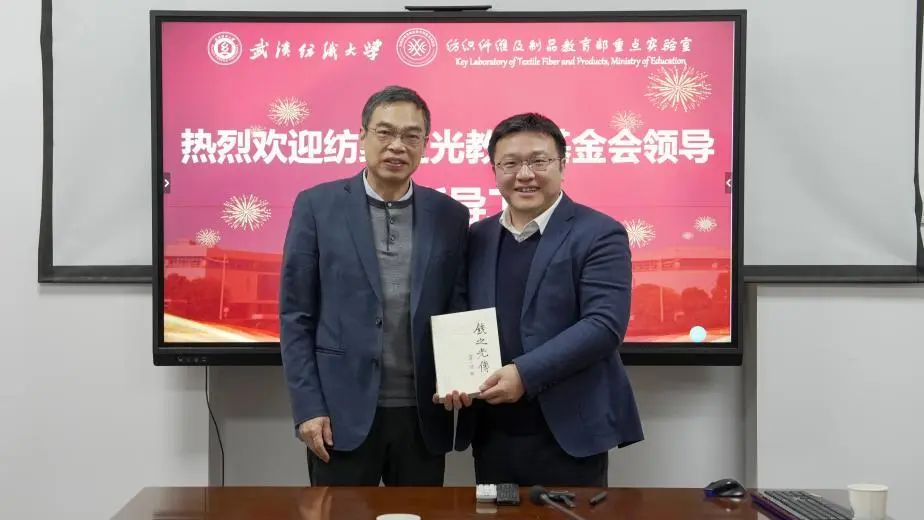 ![]() 紡織之光科技教育基金會(huì)理事長葉志民向武漢紡織大學(xué)副校長王棟贈(zèng)送《錢之光傳》。 |