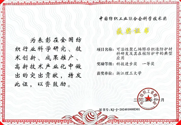 2024年度中國紡織工業聯合會科學技術獎近日揭曉。由浙江理工大學、杭州路先非織造股份有限公司、世源科技(嘉興)醫療電子有限公司、東綸科技實業有限公司、中紡標檢驗認證股份有限公司等單位共同完成的項目“可溶性聚乙烯醇非織造防護材料研發及其在核防護中的典型應用”榮獲科技進進步獎一等獎。
