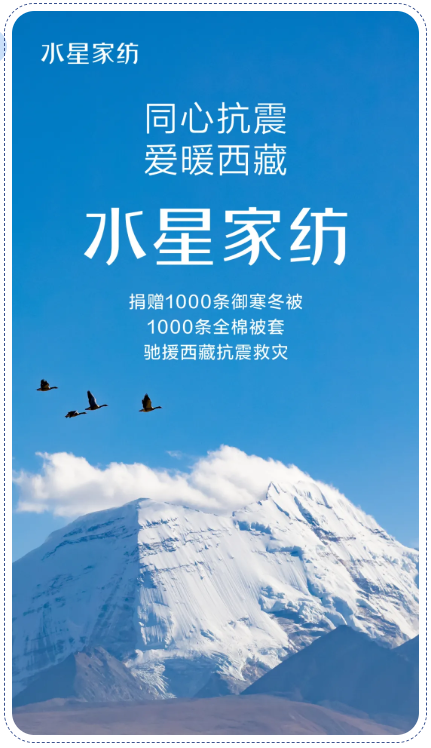 截至1月10日,紡織之光科技教育基金會(huì)已收到來自上海水星家用紡織品股份有限公司1000條御寒冬被、1000條全棉被套、河北國(guó)欣純棉家紡有限公司240床冬被、上海妙宅科技發(fā)展有限公司100床冬被、上海珍奧生物科技有限公司100條保溫毯、潮州市琦銳服飾有限公司500件兒童毛衫、寧波久耀服飾有限公司旗下DC童裝品牌500余件冬裝等御寒衣物等物資捐贈(zèng)意向。蕓想品牌及初選科技等企業(yè)也表示將捐贈(zèng)款物,共同馳援西藏,助力受災(zāi)群眾臨時(shí)安置、災(zāi)后重建和生活物資保障工作。