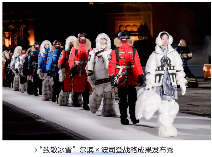 12月18日,“致敬冰雪”爾濱×波司登戰略成果發布活動在哈爾濱索菲亞教堂廣場隆重開幕,“致敬冰雪”時尚大秀閃耀冰城。早在6月,波司登集團與哈爾濱官方正式確立了高站位、高起點、全方位的戰略合作關系。雙方攜手推出“爾濱×波司登”聯名系列,同時,波司登在哈爾濱進行產業投資,涵蓋研發、鵝絨全產業鏈及服裝生產基地建設,進一步完善了冰雪裝備產業鏈,為當地創造就業機會,有力推動了哈爾濱冰雪經濟的可持續發展。