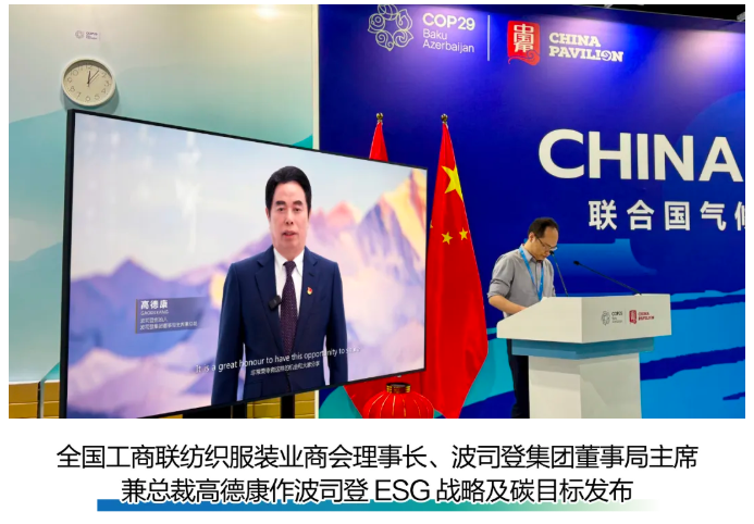 11月12 日,共建綠色“一帶一路”的全球企業暨首屆亞布力可持續發展年會主題活動在巴庫盛大舉行。全國工商聯紡織服裝業商會理事長、波司登集團董事局主席兼總裁高德康以視頻會議形式參加年會,發表了主題為《以消費者為導向,引領可持續時尚》的波司登 ESG 戰略及碳目標發布演講。波司登集團董事會辦公室主任兼資本市場總監陳皓進行了現場解讀與交流。