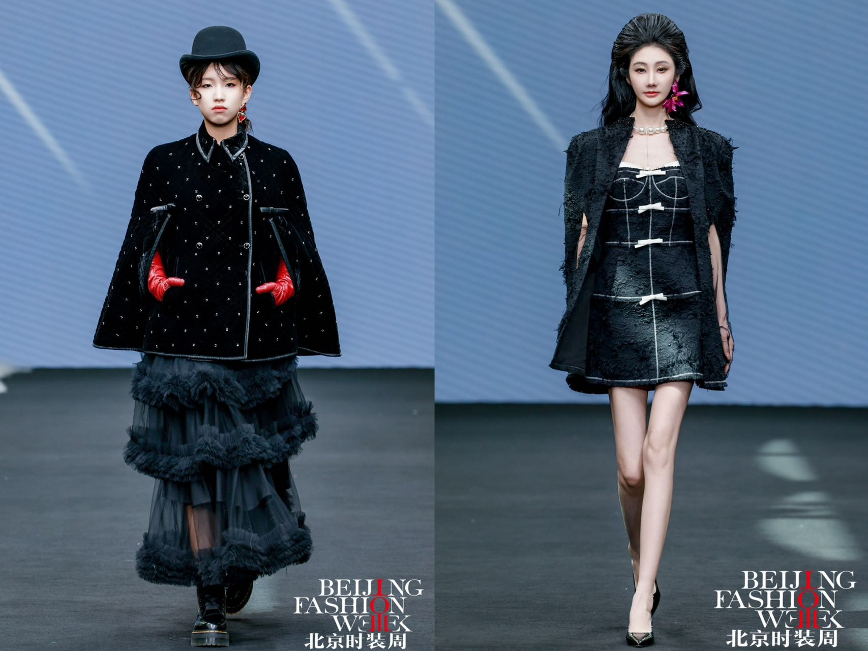 ![]() 壓軸的黑色午夜系列登場,開場模特是姜亞彤(Rachel Jiang),閉場模特為高夢涵。該系列以沉穩(wěn)大氣的黑色為主色調(diào),將觀眾拉回現(xiàn)實世界。最后設(shè)計師梁晨攜本場開場模特曲婧雅、壓軸模特周曼妮Mandy Jasmine Chow震撼出場。設(shè)計師借助不同材質(zhì)拼接和光影運用,營造出午夜的靜謐深邃,寓意著無論白天多么精彩,最終都要回歸現(xiàn)實、面對自我。