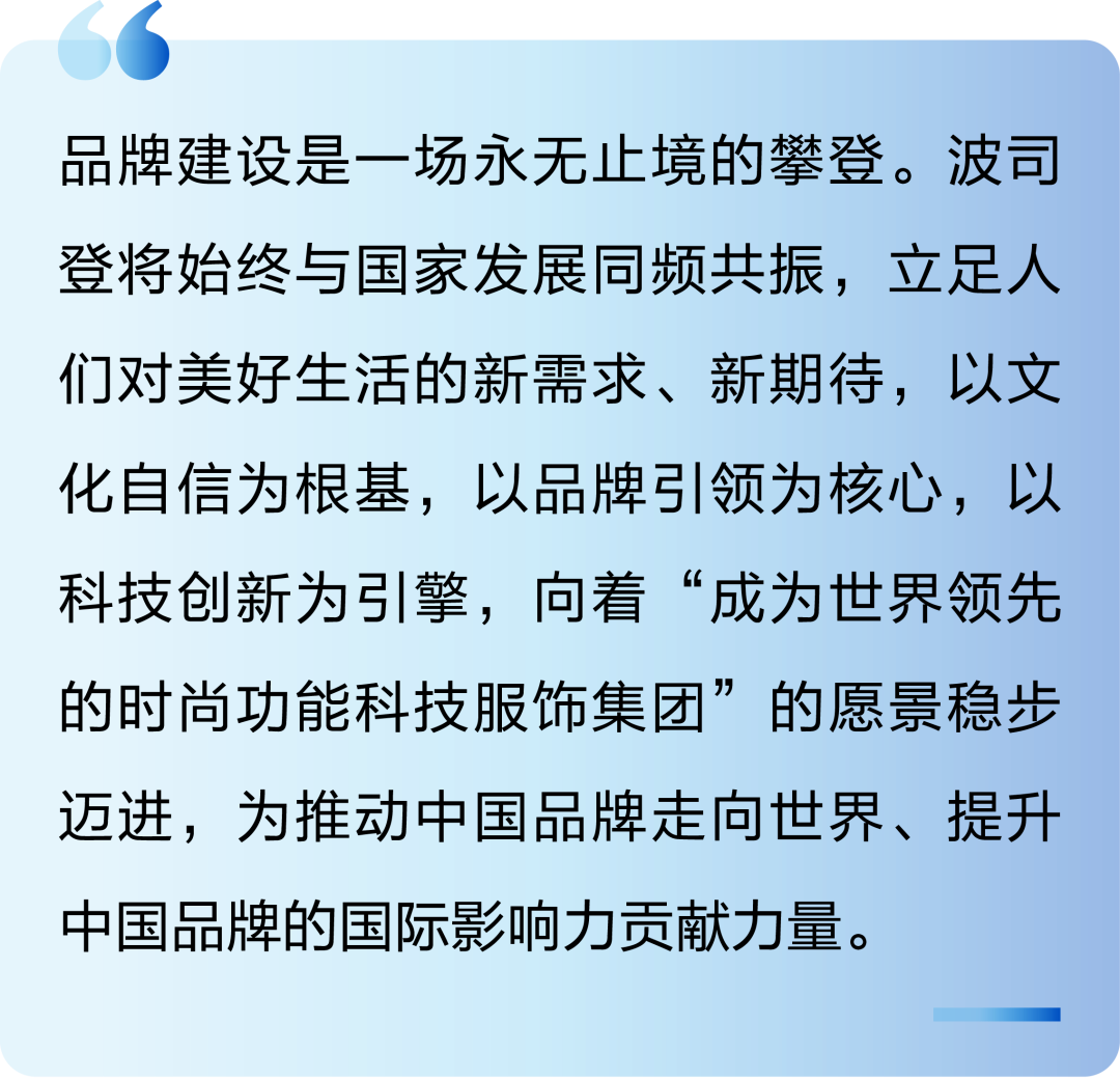 在全球品牌競爭的激烈浪潮中,創新是品牌脫穎而出、持續發展的核心動力。波司登以敏銳的市場洞察力和前瞻性的戰略眼光,聚焦羽絨服核心主業,以東方美學與科技創新驅動品牌戰略升級,在品牌建設、產品研發、數智經營、可持續發展等多維度持續發力,推動品牌價值不斷攀升。