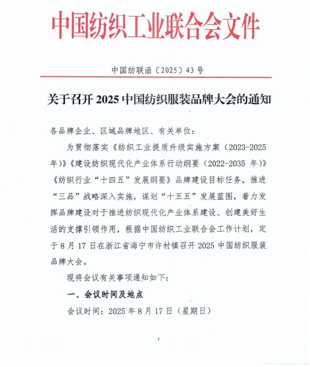 以“錦繡東方 品牌向上”為主題的2025中國(guó)紡織服裝品牌大會(huì)定于8月17日在海寧許村召開,這場(chǎng)大會(huì)絕非簡(jiǎn)單的行業(yè)聚會(huì),而是紡織產(chǎn)業(yè)響應(yīng)國(guó)家戰(zhàn)略、直面發(fā)展訴求,以品牌為刃攻堅(jiān)現(xiàn)代化升級(jí)的重要行動(dòng)。其背后,是紡織工業(yè)在政策指引、產(chǎn)業(yè)轉(zhuǎn)型與消費(fèi)迭代多重驅(qū)動(dòng)下,對(duì)高質(zhì)量發(fā)展路徑的深度探尋。