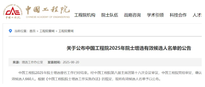 8月20日,中國工程院發(fā)布公告,公布2025年院士增選有效候選人名單。公告稱:中國工程院2025年院士增選提名工作已經(jīng)結(jié)束。經(jīng)中國工程院第八屆主席團(tuán)第十六次會議審議,中國工程院黨組審定,確認(rèn)中國工程院2025年院士增選有效候選人660人。