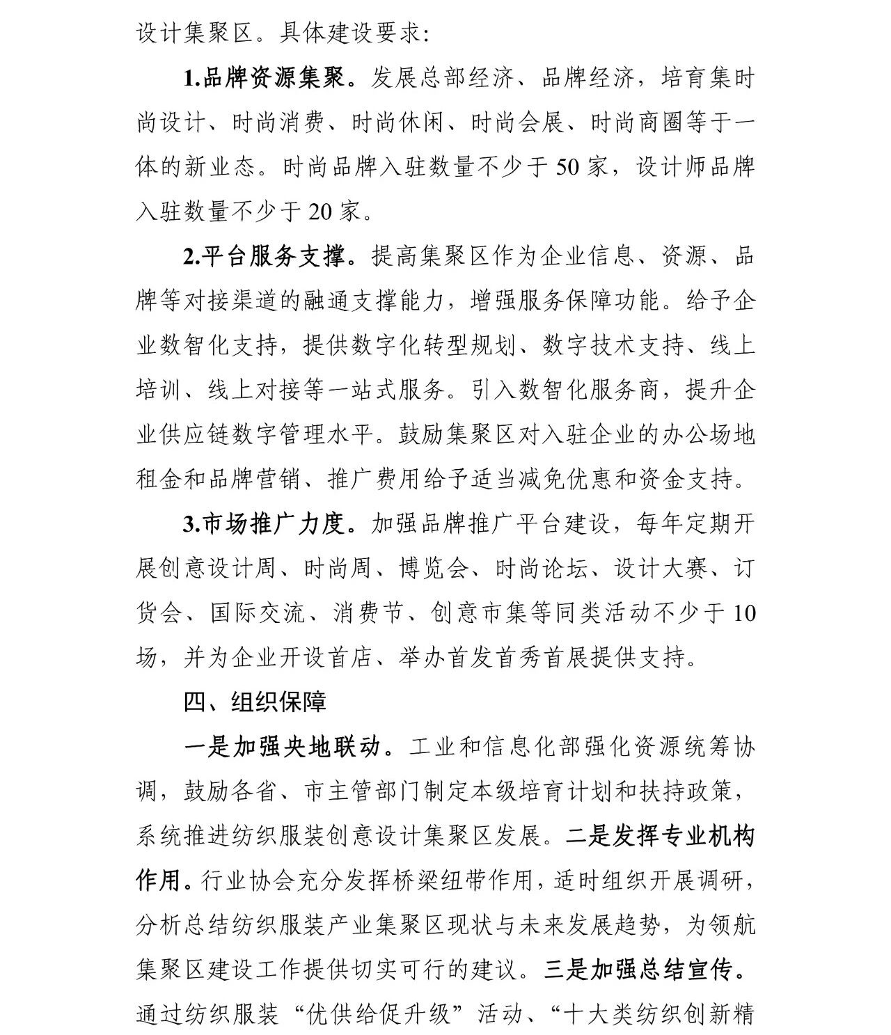 《指引》提出,工業和信息化部強化資源統籌協調,鼓勵各省、市主管部門制定本級培育計劃和扶持政策,系統推進紡織服裝創意設計集聚區發展。發揮專業機構作用。行業協會充分發揮橋紐帶作用,適時組織開展調研,分析總結紡織服裝產業集聚區現狀與未來發展趨勢,為領航集聚區建設工作提供切實可行的建議。加強總結宣傳。通過紡織服裝“優供給促升級”活動、“十大類紡織創新精品”等平臺,全方位宣傳創意設計賦能產業轉型升級的集聚區創新發展模式和工作成效。