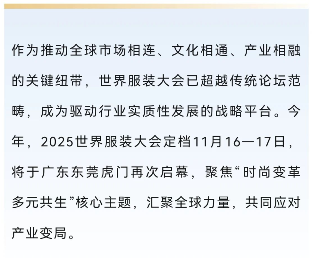 促成商機對接、明確產業方向、升華文化價值,世界服裝大會正持續不斷地為行業源頭活水。在“時尚變革 多元共生”的主題指引下,2025世界服裝大會必將進一步夯實其作為行業凝聚共識、協同創新、邁向未來的核心地位與關鍵作用。 |