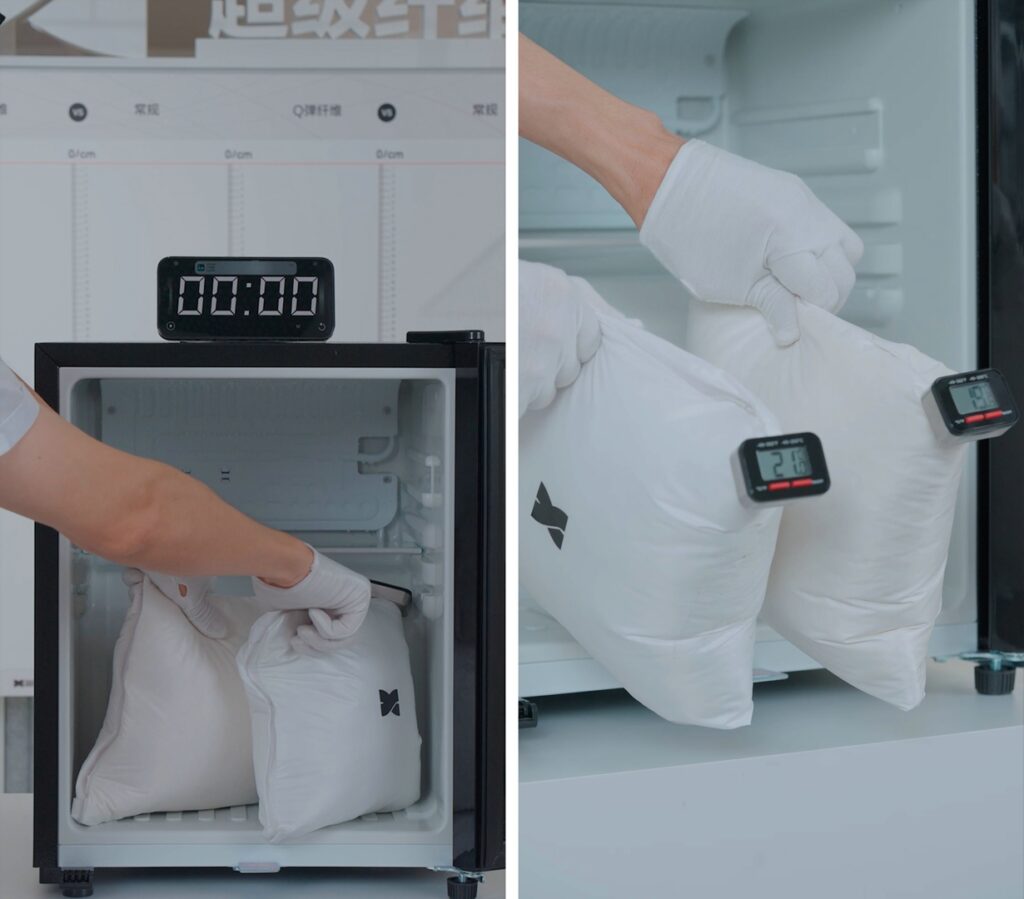 將處于相同溫度環境下的“暖芯纖維”制成的科技棉包和90絨子含量制成的羽絨包,同時放入冰柜中,8分鐘以后,分別查看包裹在兩者中間的溫度計的指數,可以看出“暖芯纖維”保暖效果可媲美90絨。