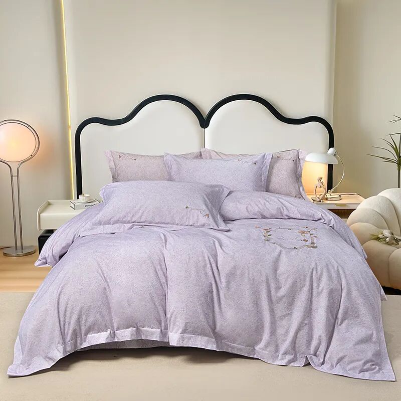 ![]() 知行系列融合“輕法式優雅”與“現代簡約”,以床頭曲線呼應床品的柔色調與簡約裝飾,貼合當下臥室空間的“松弛感美學”。主色調為淺霧紫,靈感來自秋冬薄霧與薰衣草田的柔和氛圍,既雅致又適配多數臥室光線,營造舒緩休憩環境。面料選用全棉肌理磨毛,回應秋冬對“溫暖觸感”的需求,通過磨毛工藝還原天然織物的蓬松感,保留棉質的親膚特性,兼顧舒適與實用。刺繡元素以“自然輕裝飾”為理念,提取簡約植物線條,弱化繁復圖案,使裝飾與面料質感相得益彰,精致而不冗余。