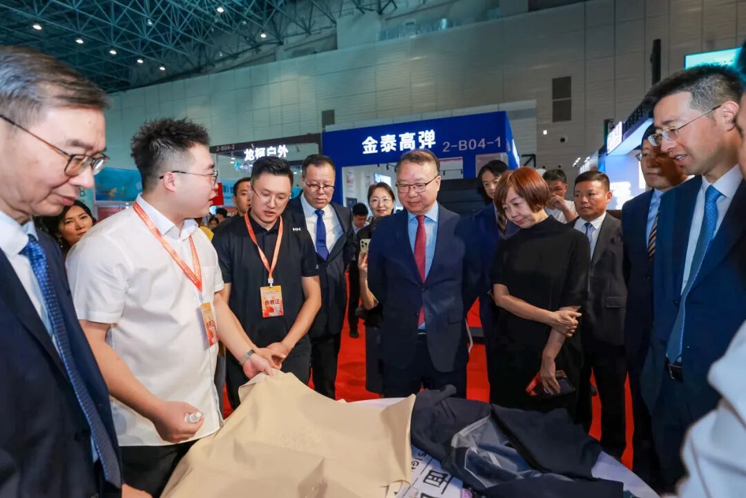 “高強耐磨輕量通勤沖鋒衣面料”則專注于提升戶外穿著體驗與安全防護。核心亮點在于運用了高分子聚乙烯材料,充分發揮了其超強耐磨、極致輕量化的先天優勢。同時,基于紗線本身優異的抗沖擊性和防切割性,使得最終成型的面料能夠輕松應對嚴苛的戶外環境,耐用性顯著提升。在現場,羅曼羅蘭女裝產品總監徐華柱用剪刀嘗試切割面料的演示,直觀地驗證了該聚乙烯材料難以被輕易割開的特性,其出色的防護性能給在場領導留下了深刻印象。