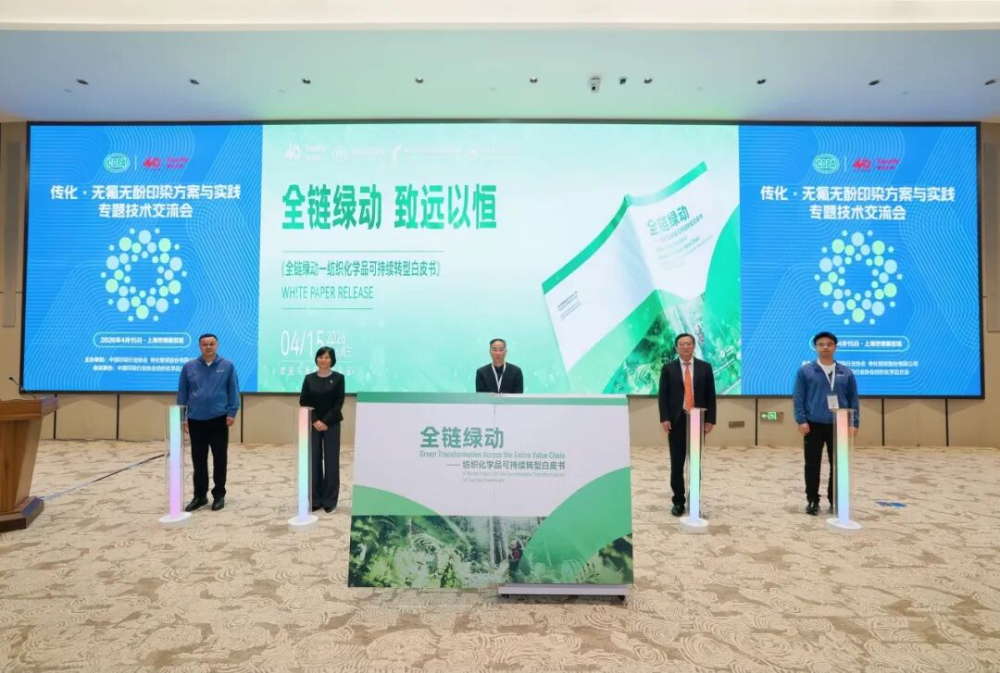 為全面落實國家精準科學治污要求,加強污染物源頭防控,推動全產(chǎn)業(yè)鏈協(xié)同升級,4月15日下午,“傳化·無氟無酚印染方案與實踐專題技術(shù)交流會”在上海成功舉辦。本次會議圍繞無氟無酚助劑與印染新工藝協(xié)同適配、生產(chǎn)全流程閉環(huán)管控、綠色紡織品市場化價值轉(zhuǎn)化等現(xiàn)階段多維度核心難題,鏈接專業(yè)院校、科研機構(gòu)、行業(yè)組織、紡織企業(yè)代表等齊聚一堂展開深度研討,會上同步發(fā)布《全鏈綠動-紡織化學品可持續(xù)轉(zhuǎn)型白皮書》,旨在加快推動印染助劑源頭綠色替代,構(gòu)建產(chǎn)學研用協(xié)同、上下游聯(lián)動的供應鏈全流程管控體系,破解PFAS與酚類物質(zhì)替代技術(shù)難題,提升行業(yè)合規(guī)能力與可持續(xù)競爭力,助力印染行業(yè)低碳綠色轉(zhuǎn)型。