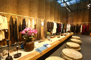 卡汶的時尚生活館以橘紅色的柔美色調,將油畫、沙發、工藝、雕塑、修飾等元素融為一體,引領一種悠然自在的藝術生活方式;MJU:T “靜謐之地”通過極簡概念和低調黑灰色系組合,結合明暗的光影及新銳裝置藝術,表達新都會菁英男裝美學;影兒“致未來”則收錄了清華大學美術學院等各大院校的新生設計力量發起藝術再創作。在簡潔自由觀展空間映托下,作品中呈現著新生代對于未來時裝的暢想……