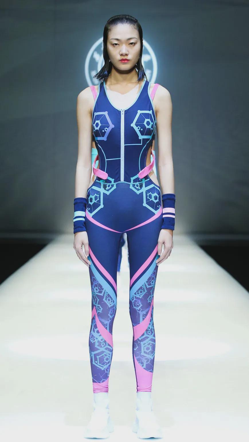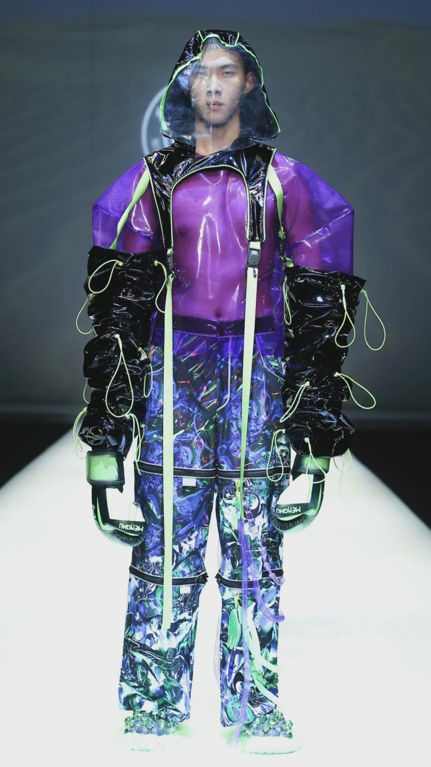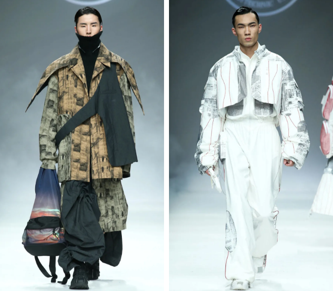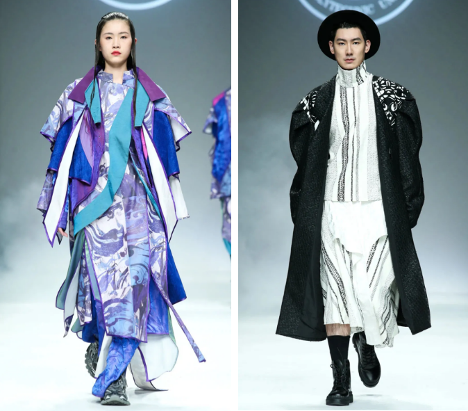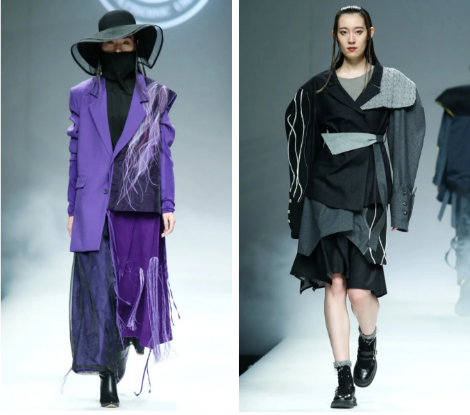 比如用線條的美感來表達山巒間的層次關系,以全新的方式來表現,欲表現出更別樣的河山風貌 。將山水間的層疊關系用結構表現,結合流線型的線條進行美化的修飾,主色調是白色與米白色,紫色做為點綴,山水的表現通過衣片的前后層疊及顏色深淺的輔助,構建出全新的山水詮釋,與服裝進行優(yōu)雅、前衛(wèi)時尚的結合。