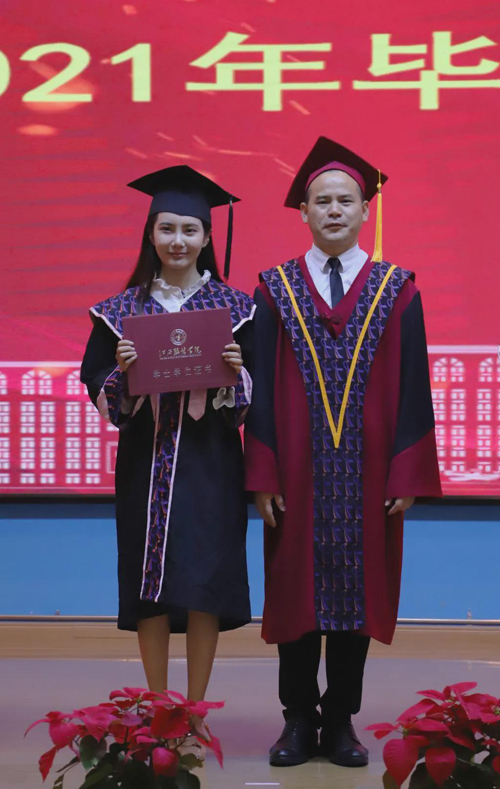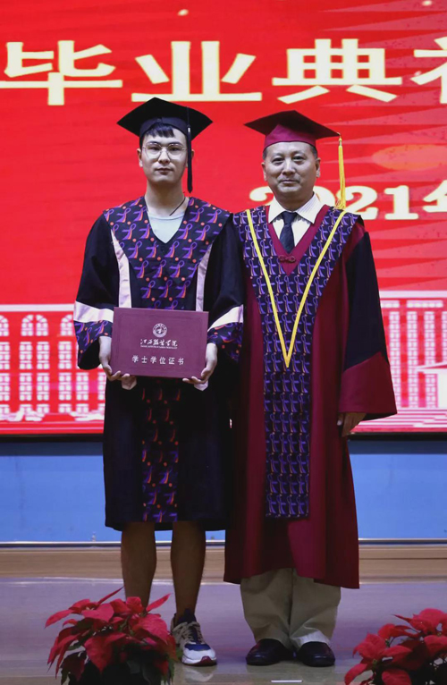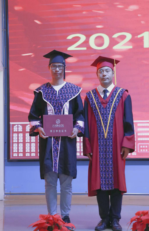 ![]() 校領導薛家寶、徐煒、陳東生、甘應進、唐新強、李寶君、馬國照等為2021屆畢業生頒發畢業證書,為獲得學士學位的學生正冠撥蘇、頒發學位證書并合影留念。